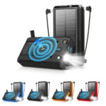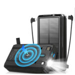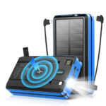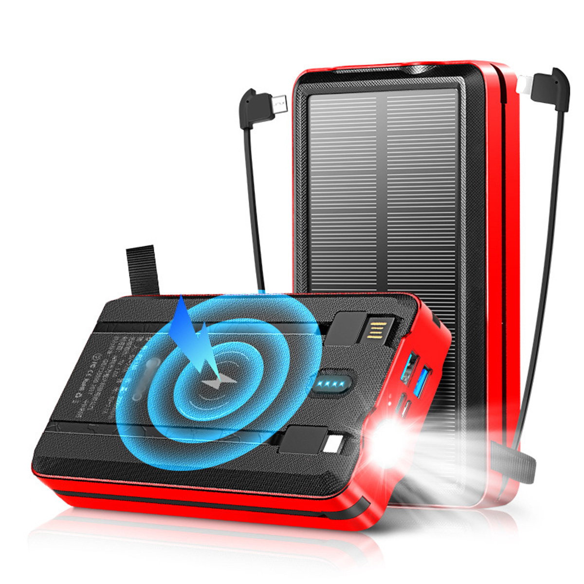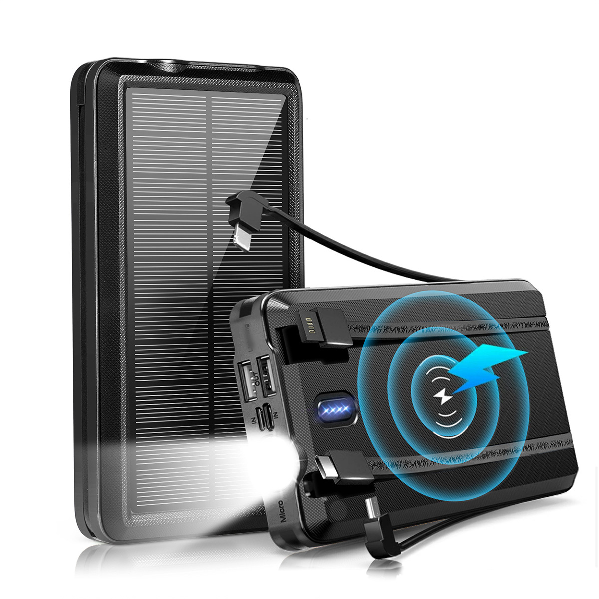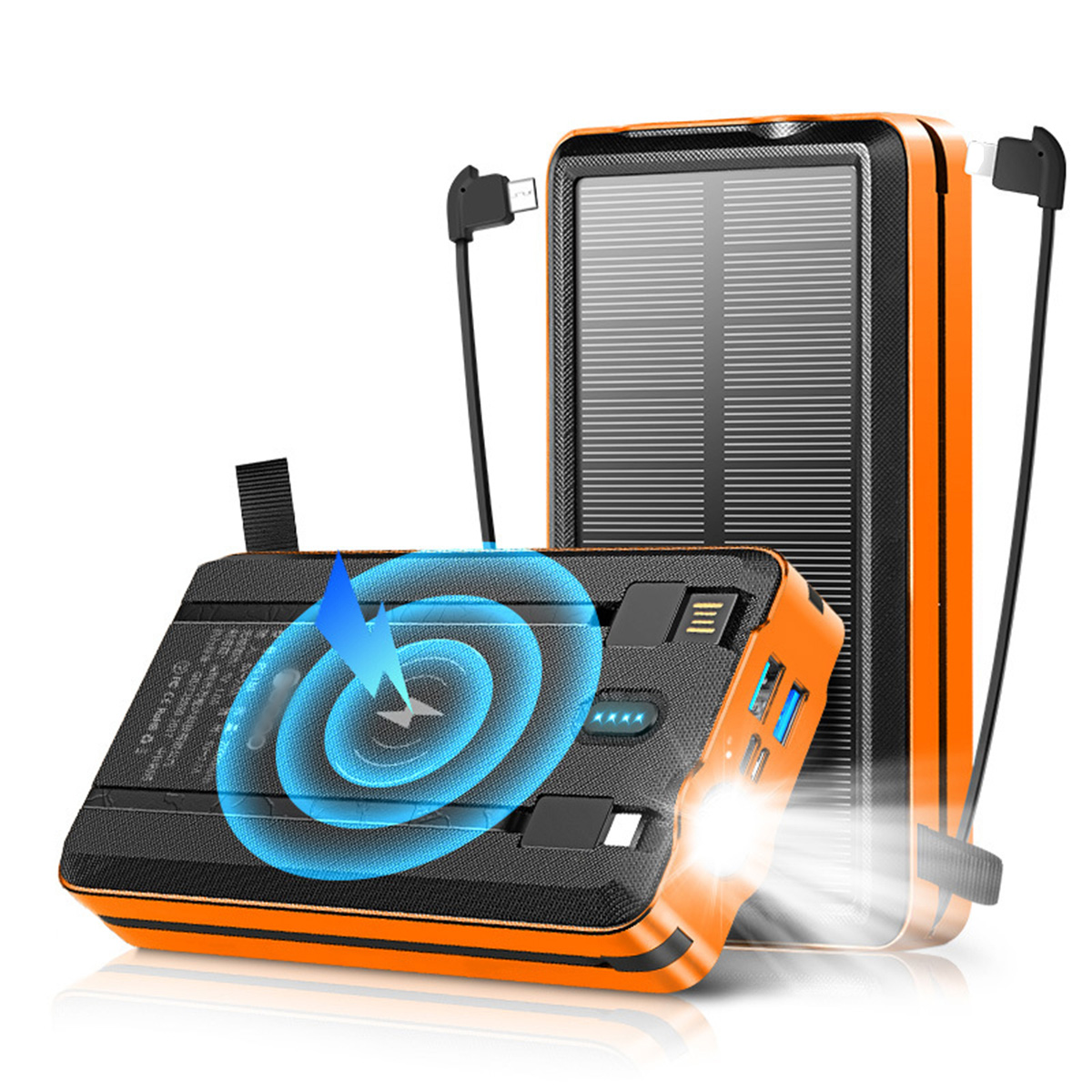 Illuminate your marketing event with our solar-activated powerbank chargers, this ABS plastic device boasts four solar cells and a charging capacity of 30000mAh. It offers five output and three input ports, a wireless charging pad for Qi-enabled devices, two integrated charging cables, and an LED flashlight. Please note that solar capacity is intended as a backup and may not be effective on cloudy or rainy days.