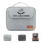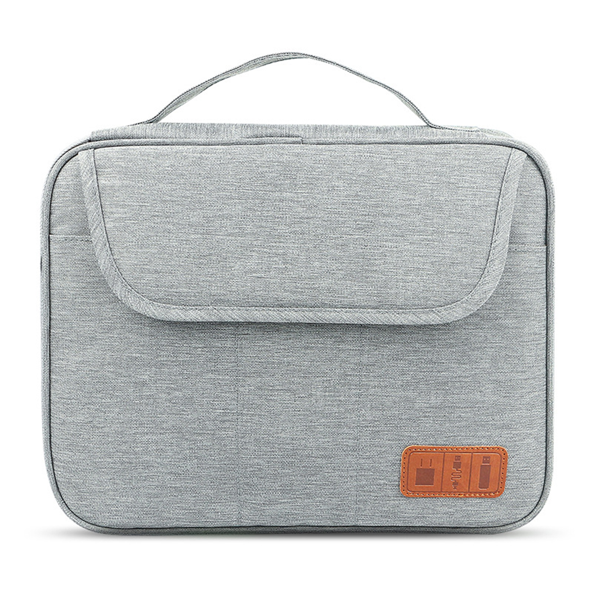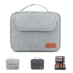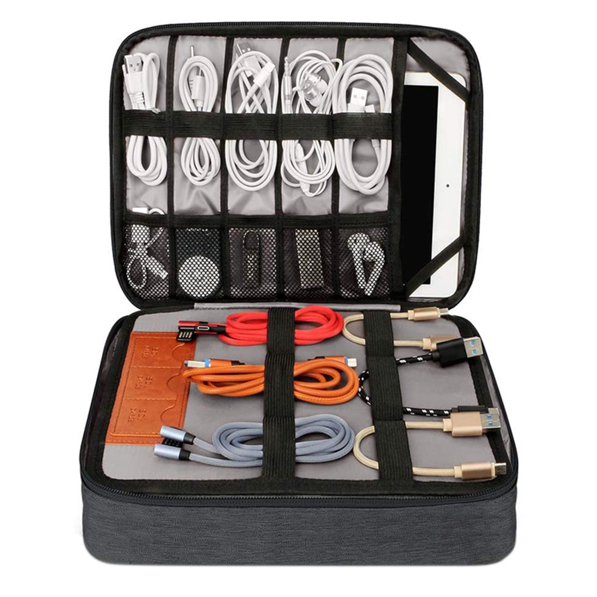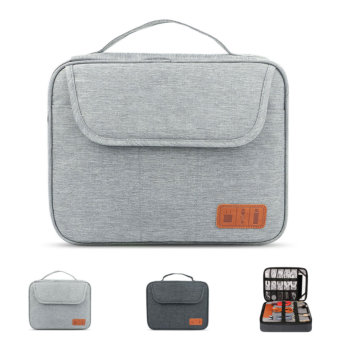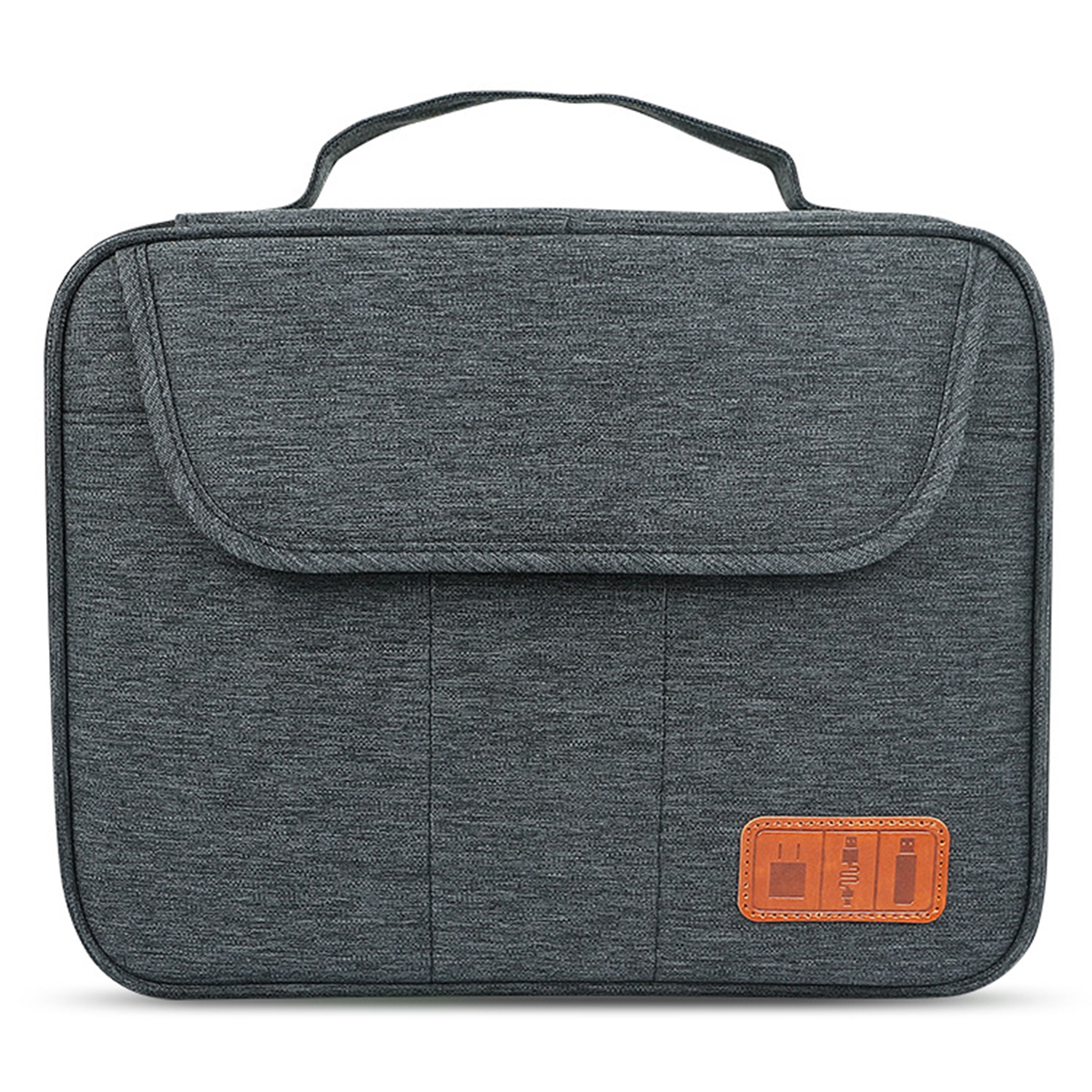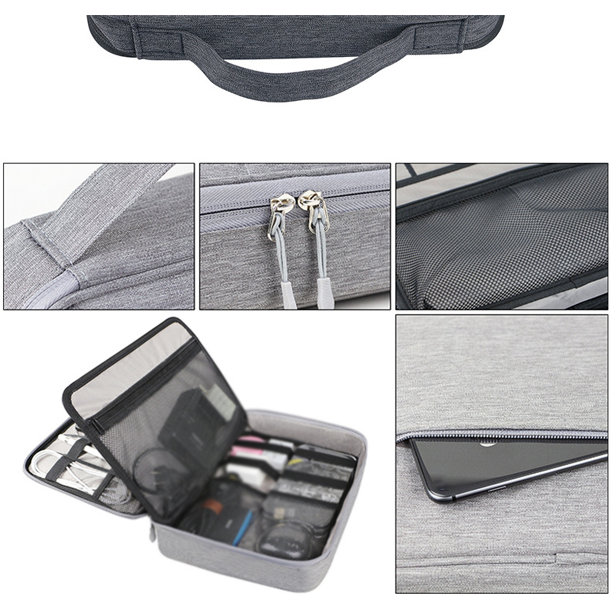 This electronics bag has a 2-layer interior with compartments made of durable oxford fabric. It features SD and SIM card slots, mesh zippered pockets, and various-sized mesh pockets to hold all your cables, USB drive, cellphone, charger, hard drive, mini tablet, and other accessories. The waterproof surface provides strong protection for your electronics, while the thicken design absorbs shocks and impacts.