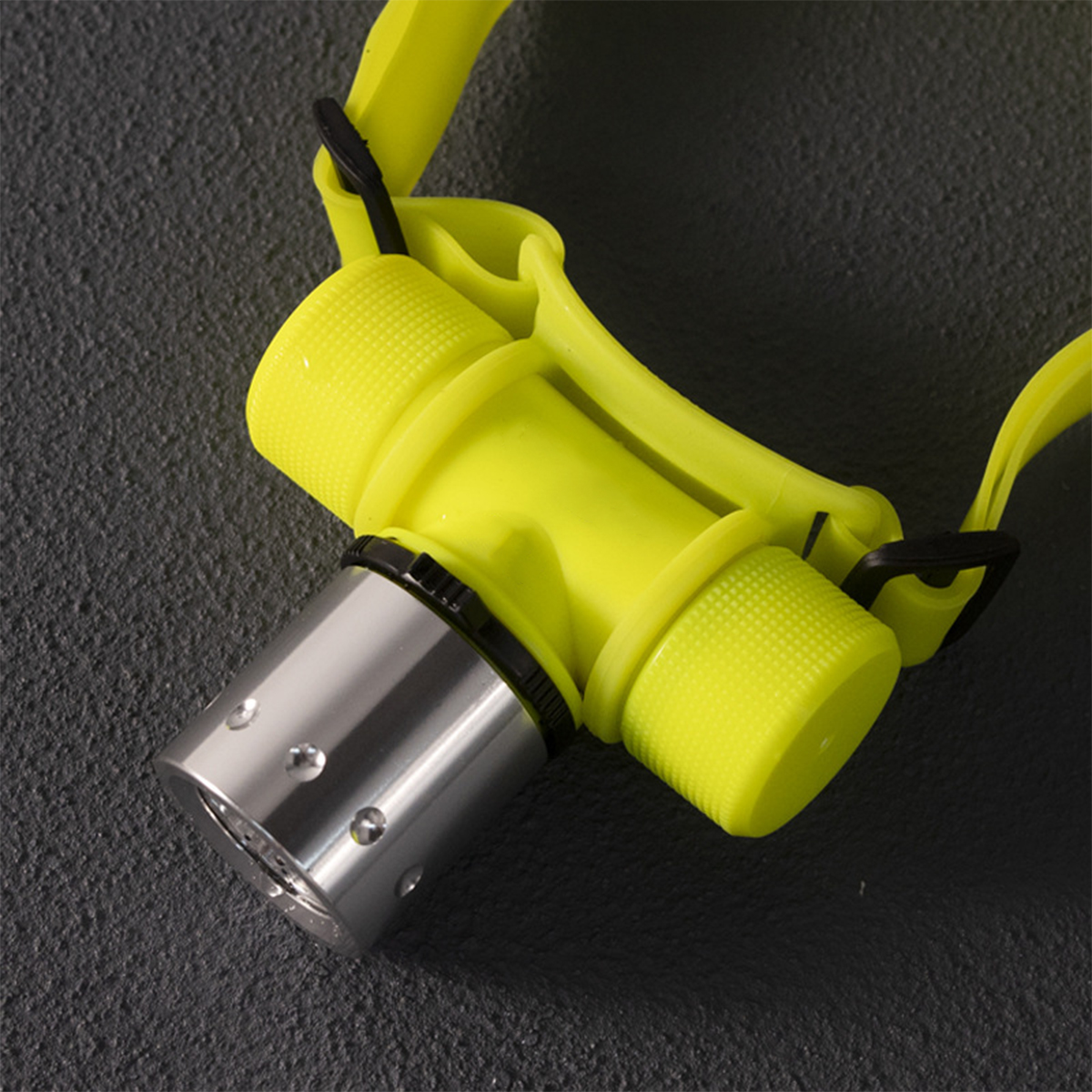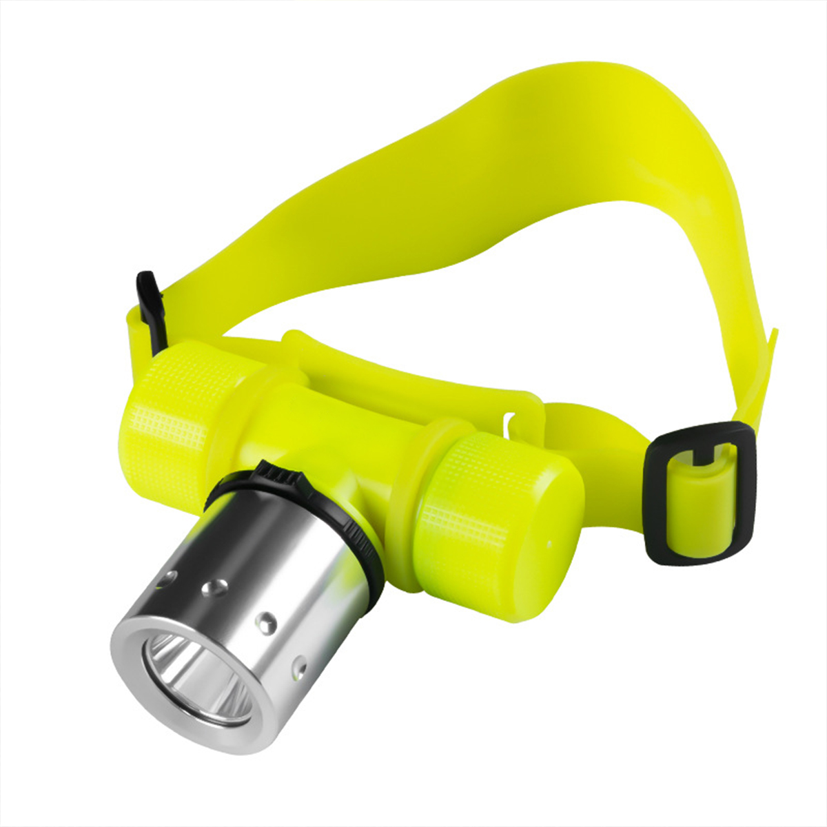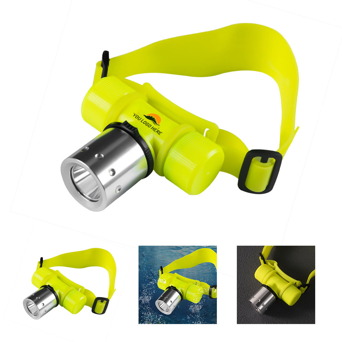 Waterproof flashlight with aluminum alloy head and fluorescence ABS body. Can be used underwater up to 80ft and has a range of 600-1600ft on land. Produces a bright output of 350 lumens with a magnetically controlled switch. Offers three modes: high, low, and strobe. Compatible with a rechargeable 18650 lithium battery or three AAA batteries (not included).